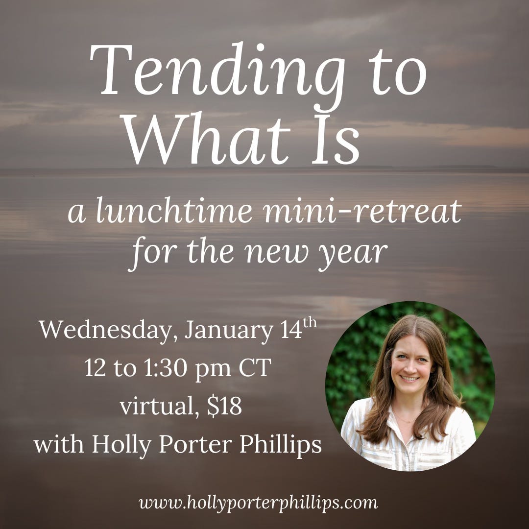 In the coming year, I’ll be offering several more lunchtime mini-retreats. My first retreat, Tending To What Is, will be on January 14th at noon CT. You can find more information and register here. ALSO! Mark your calendar for my Lent mini-retreat on February 12th.